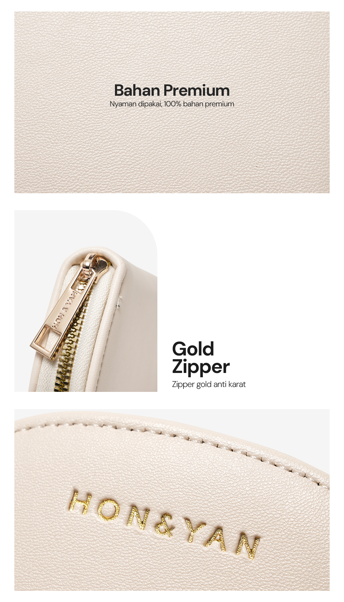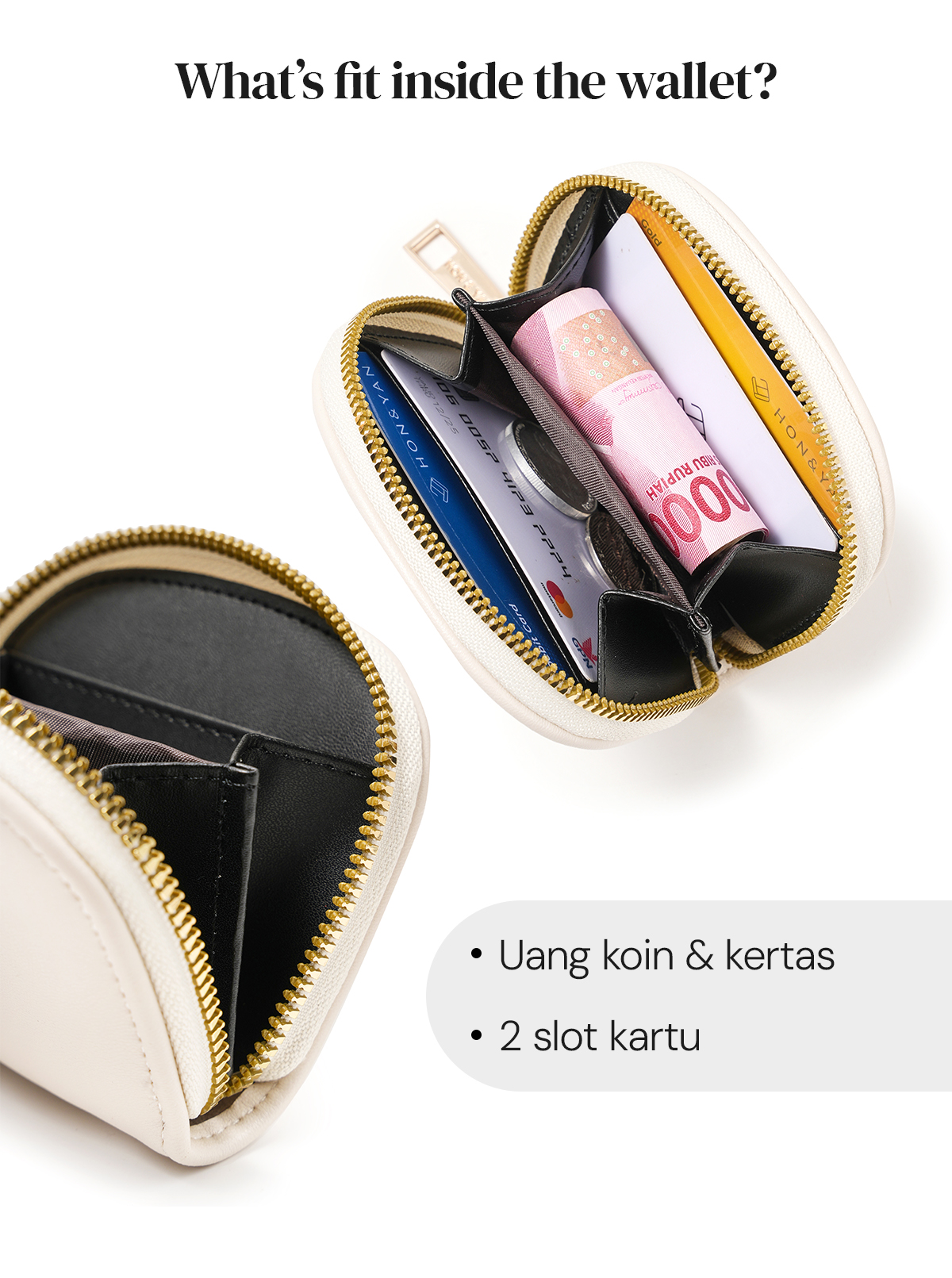 Kompartment Tambahan : Dilengkapi dengan zipper di luar dompet untuk menyimpan uang koin, dan di bagian lipat untuk menyimpan uang kertas.