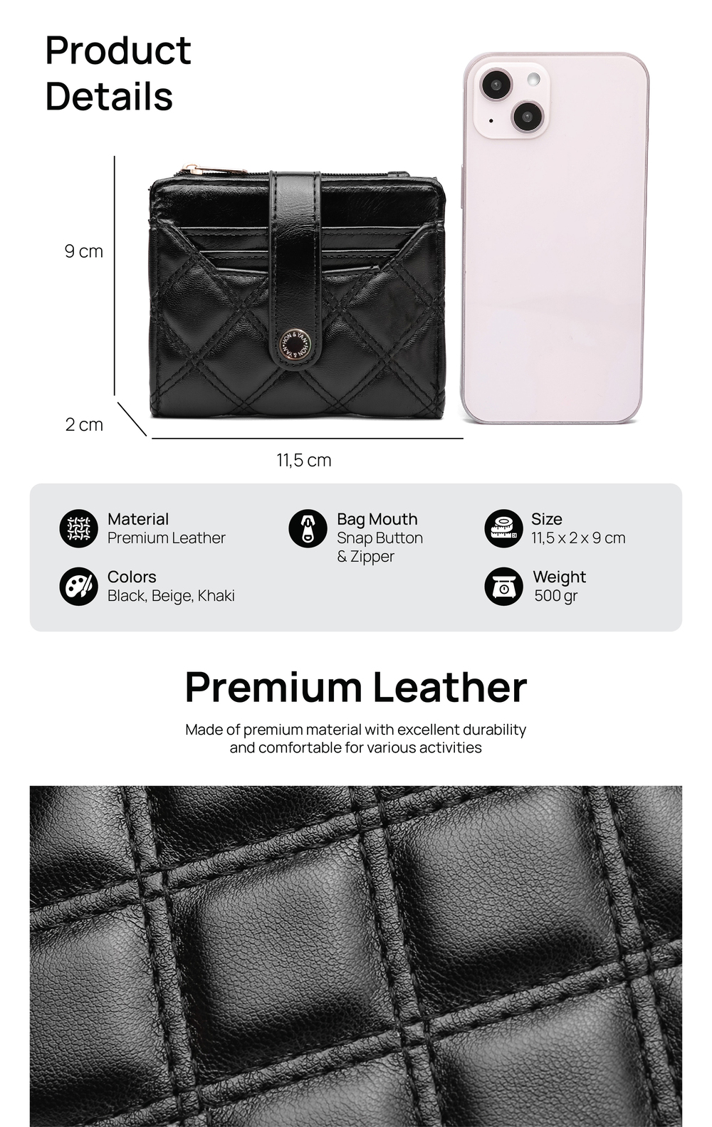 Design Modern : Terbuat dari bahan kulit sintetis berkualitas tinggi, dompet ini menampilkan design yang elegant dan simple.