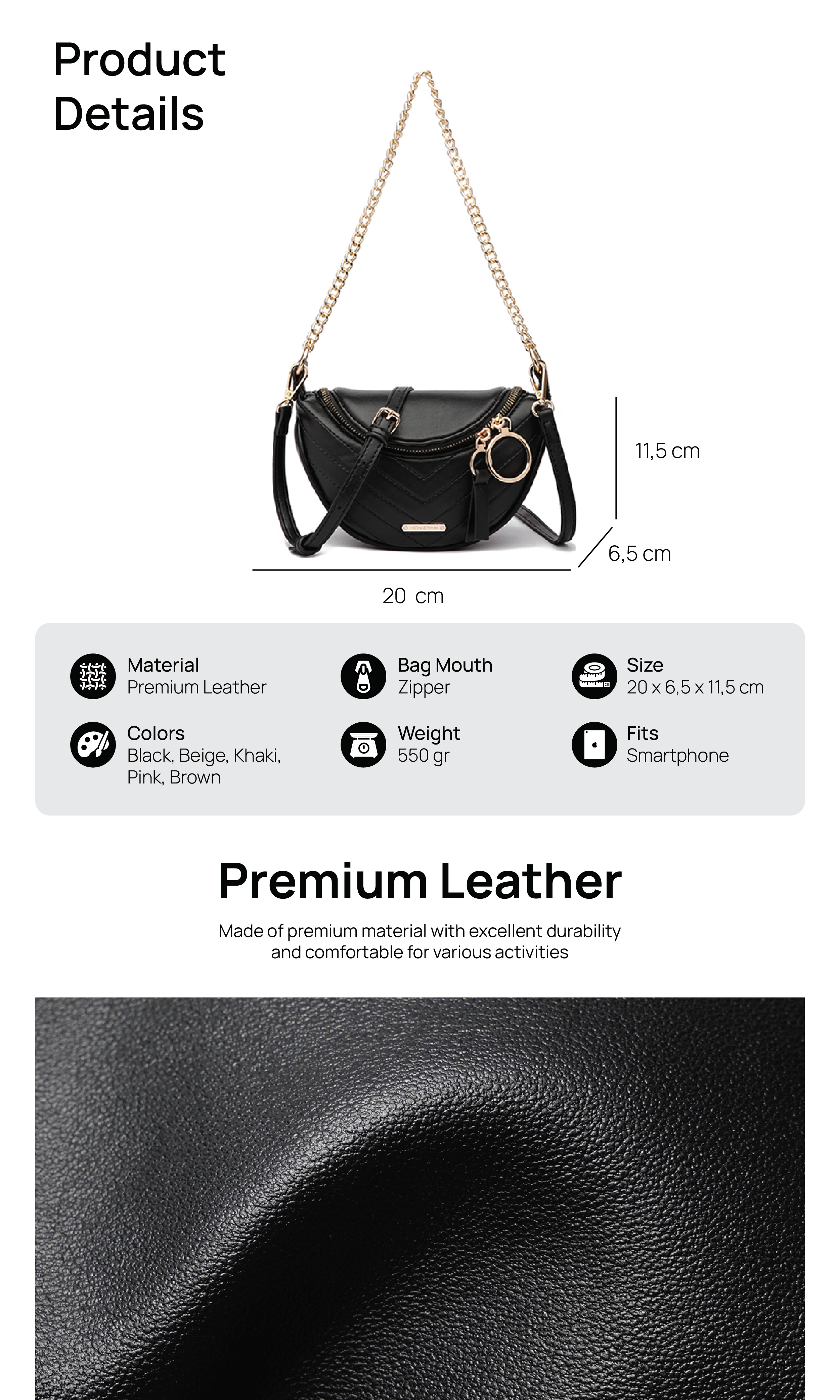 Design Modern : Terbuat dari bahan kulit sintetis berkualitas tinggi, tas ini menampilkan design yang elegant dan simple.