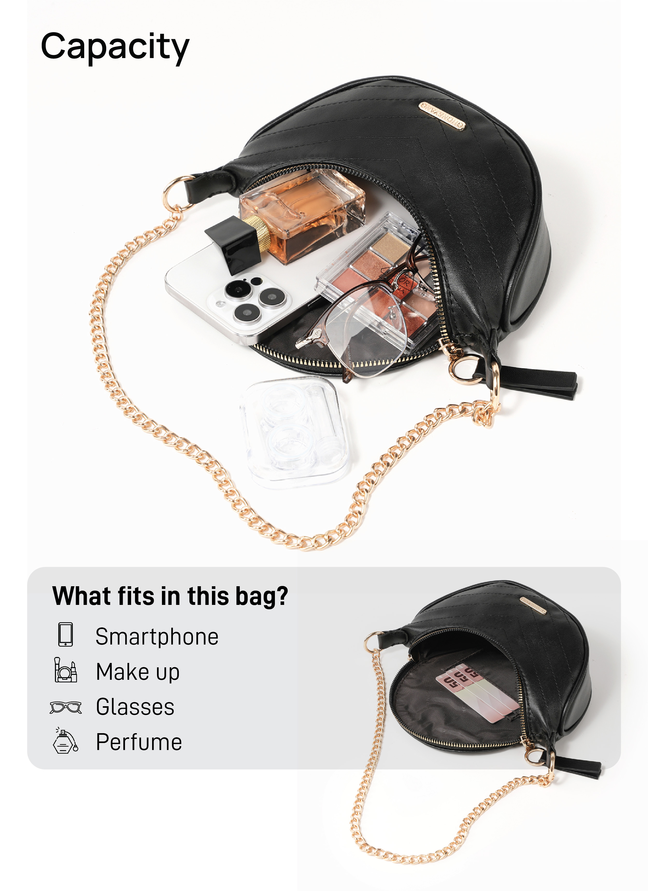 Kompartment Utama yang luas : Dilengkapi dengan Kompartment Utama yang cukup besar untuk menyimpan handphone, parfume, atau barang-barang harian lainnya.