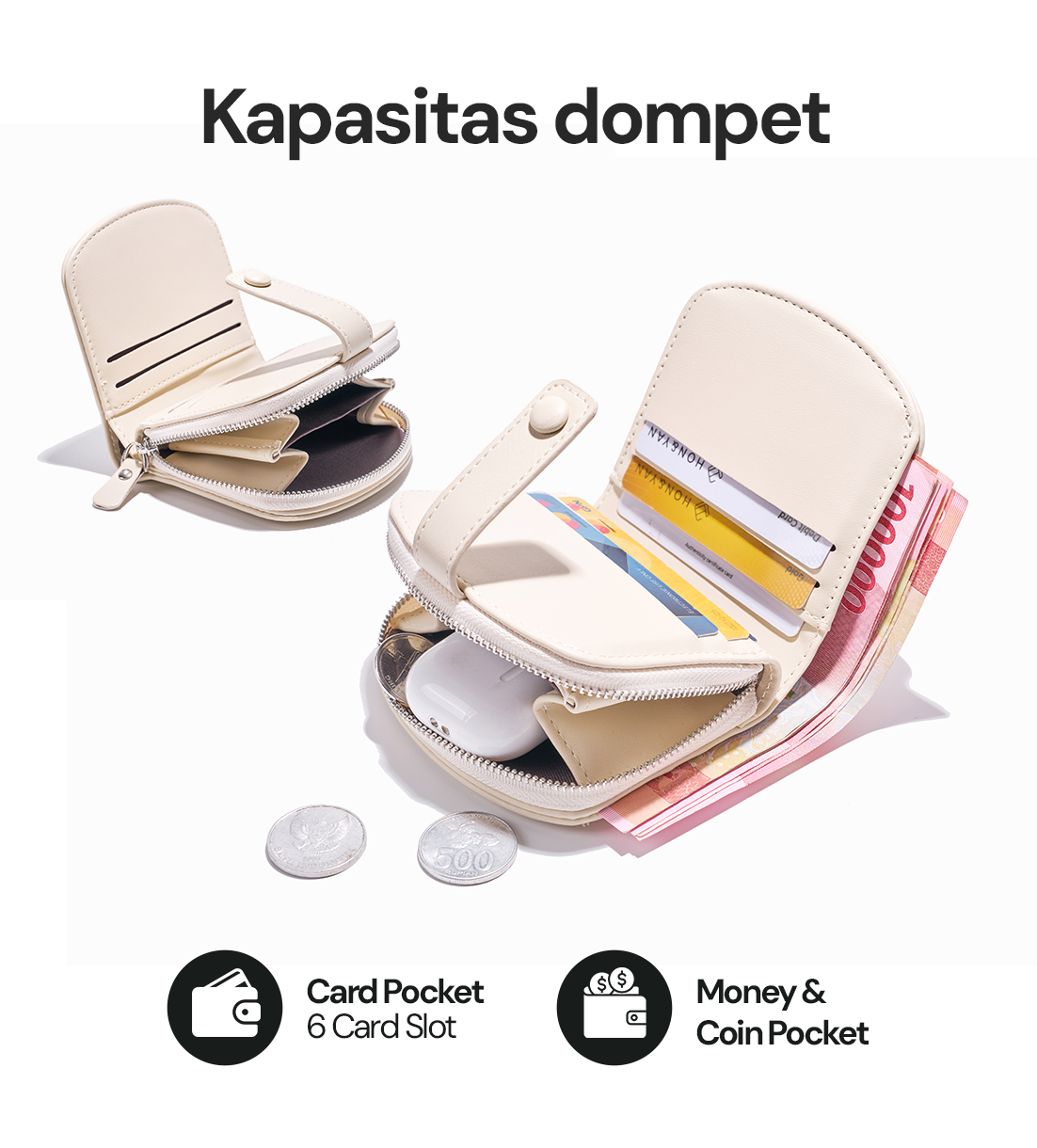 Kompartment Utama yang luas : Dilengkapi dengan Kompartment Utama yang cukup besar untuk menyimpan uang kertas, uang koin, dan berbagai macam kartu lainnya.